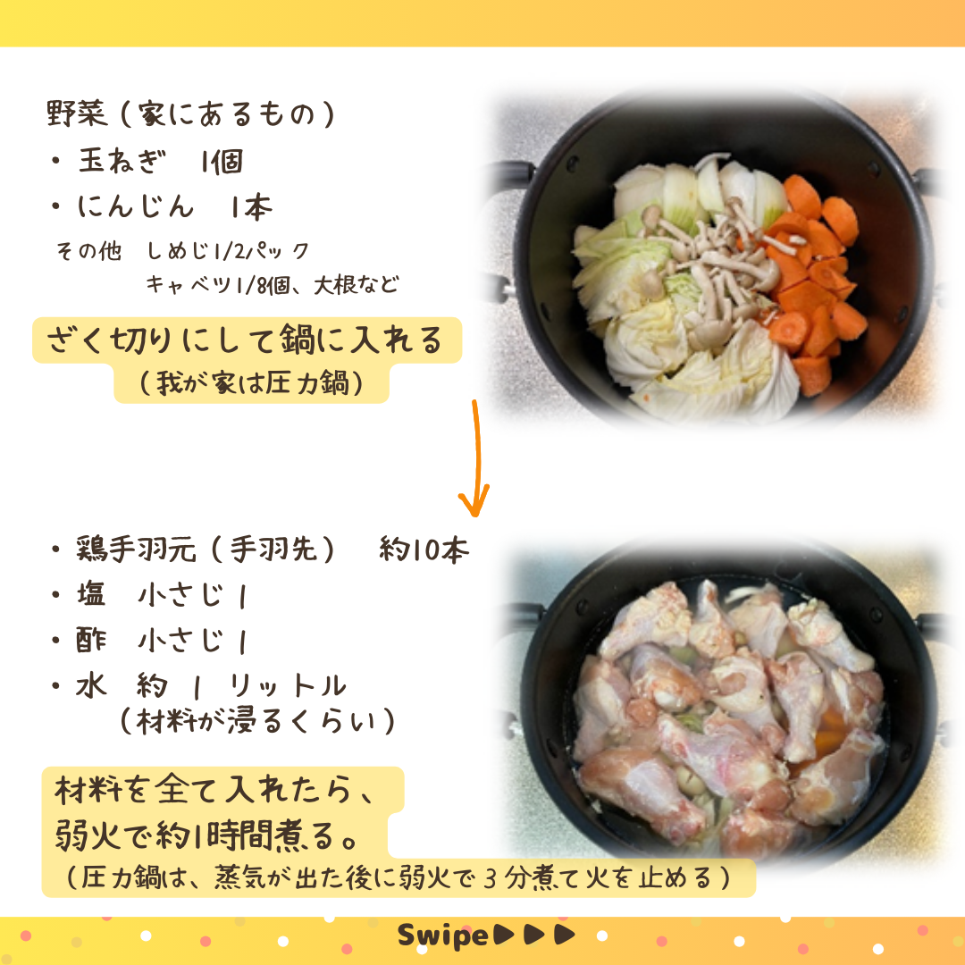 骨付き肉(魚)を長時間煮たスープのこと。アミノ酸やカルシウム・マグネシウムなどのミネラルがスープに溶け出ている。そのまま飲む、少量だけご飯を入れる、料理(煮物やカレー、炒め煮、汁物など)の出汁として使う、など使い方はさまざま。